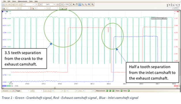 Trace 1 shows that the amount of teeth between the missing crankshaft tooth, and the next red trigger is 3.5 teeth, and the number of teeth between the end of the red trigger and the blue trigger is half a tooth.