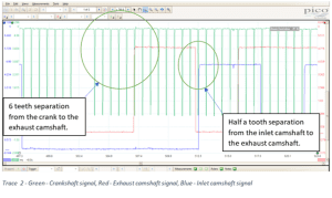 So let’s take a step back from the scary lines. What do we see? Well as we just discussed the timing between the camshafts has been proven good, as both traces match at 0.5 teeth apart. Whereas the crank to exhaust cam timing of Trace 1 is 3 teeth advanced of Trace 2