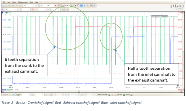 Now looking at the known good waveform of Trace 2, we can gather that the number of teeth between the cranks missing tooth on the green trace and the exhaust cams red trigger is 6 teeth, and the number of teeth between the end of the red trigger and the blue trigger is also approximately half a tooth.